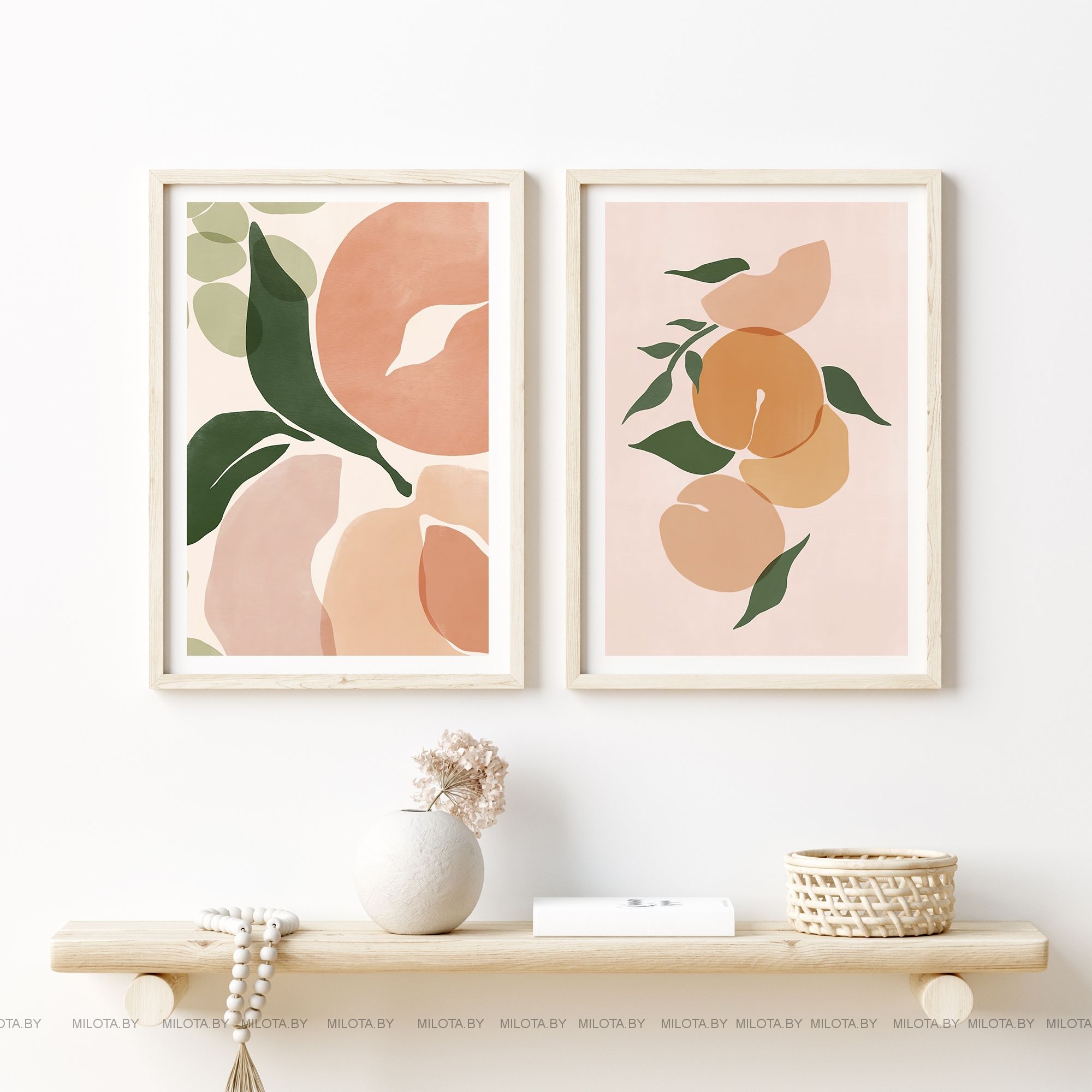 В сочный набор постеров "Персиковый коблер" входят 2 постера в деревянных рамах неокрашенного дерева, либо белого / черного цвета.