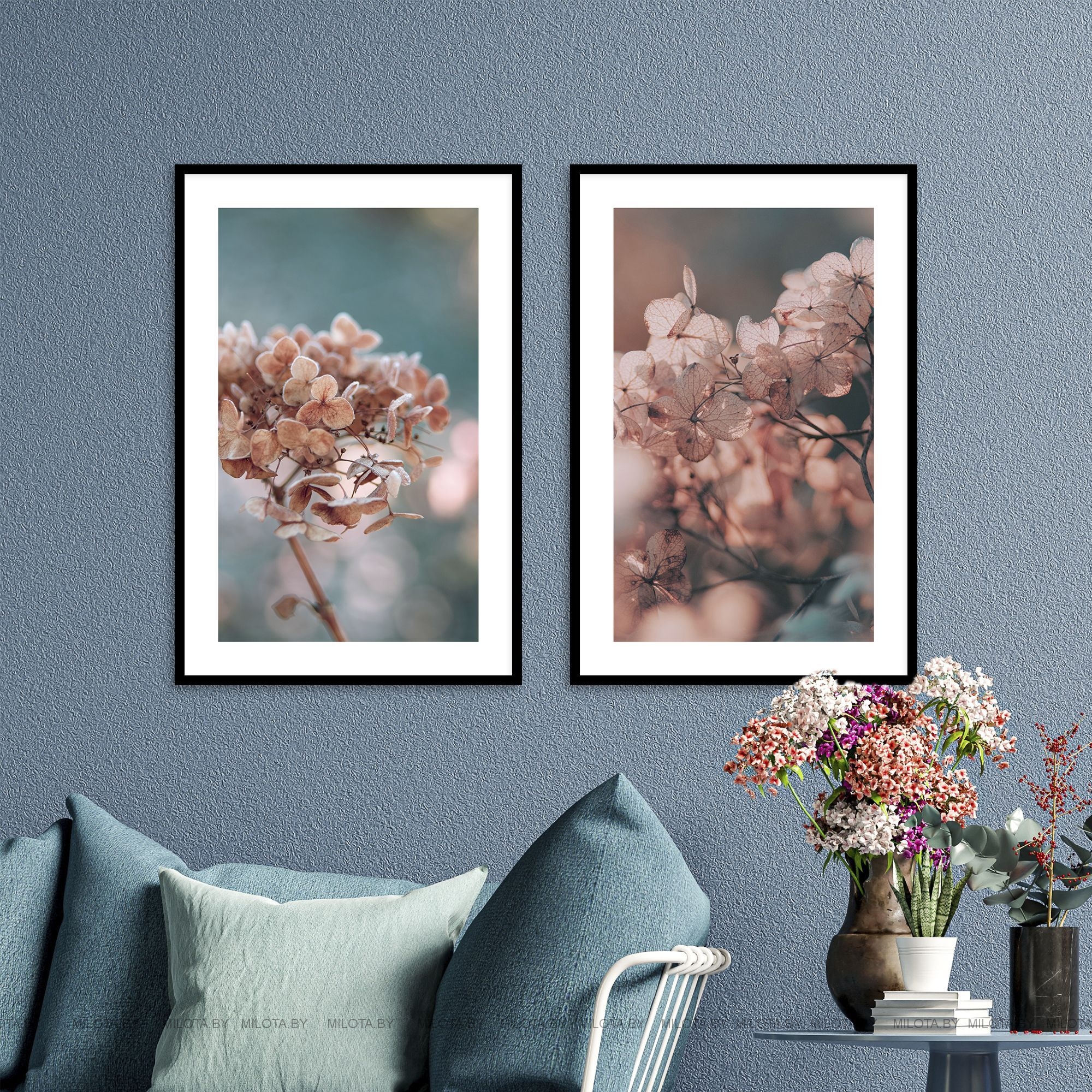 В набор входят 2 интерьерных постера размером 40х60 см в деревянных рамах неокрашенного дерева, либо белого / черного цвета.