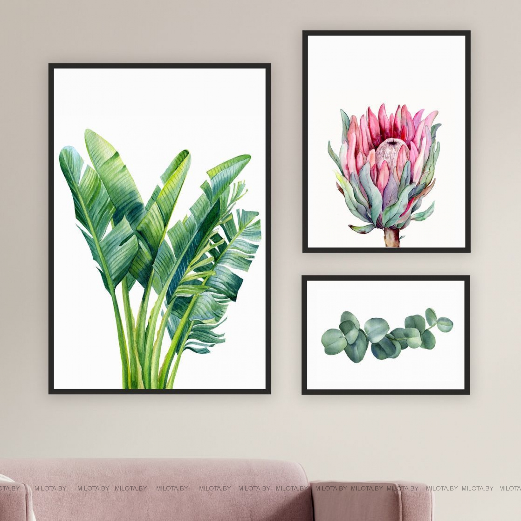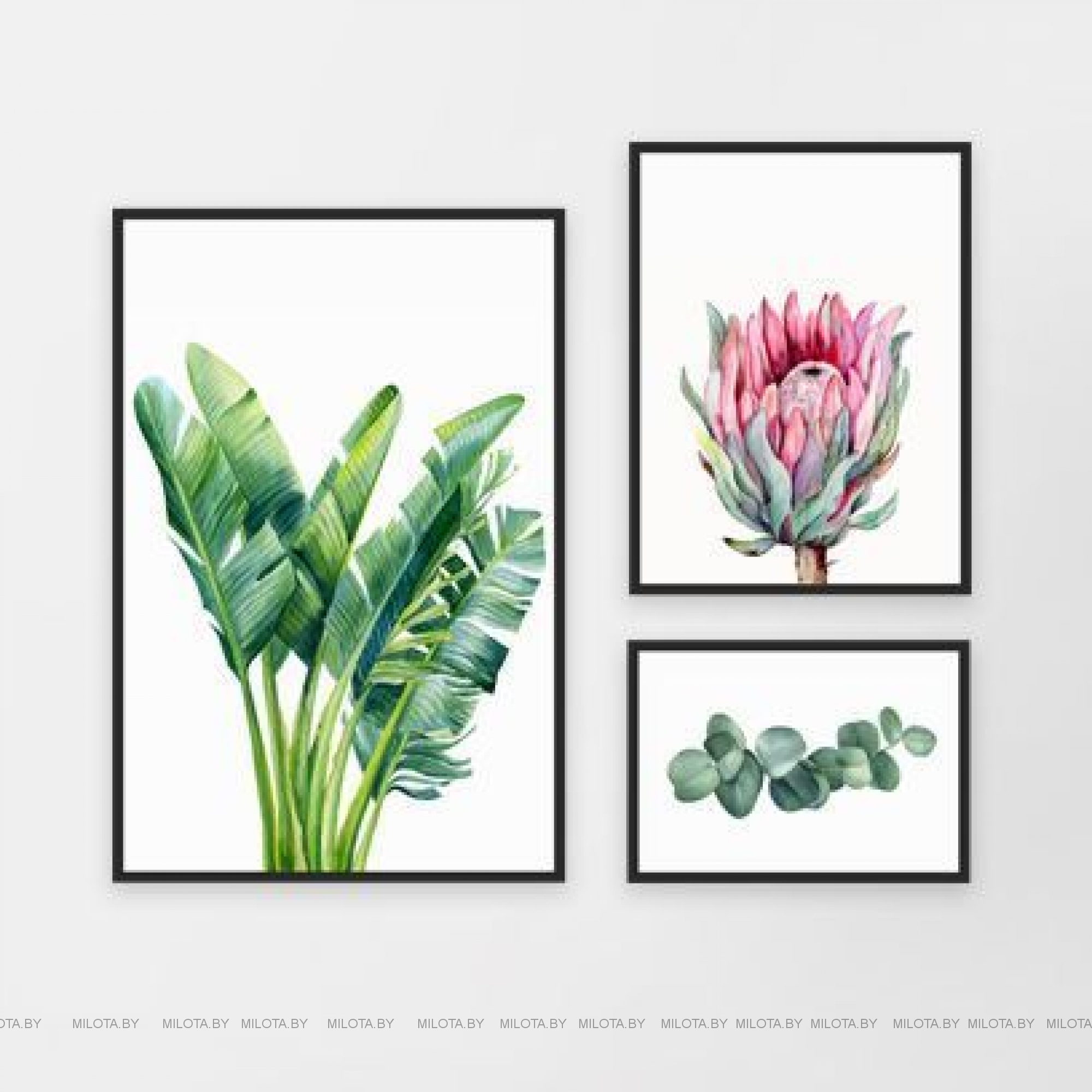 Набор постеров для оформления интерьера "Банановые листья с протеей". В набор входит:1 постер форматом А2, 1 постер форматом А3 и 1 постер форматом А4 в черных деревянных рамках с небьющимся стеклом.