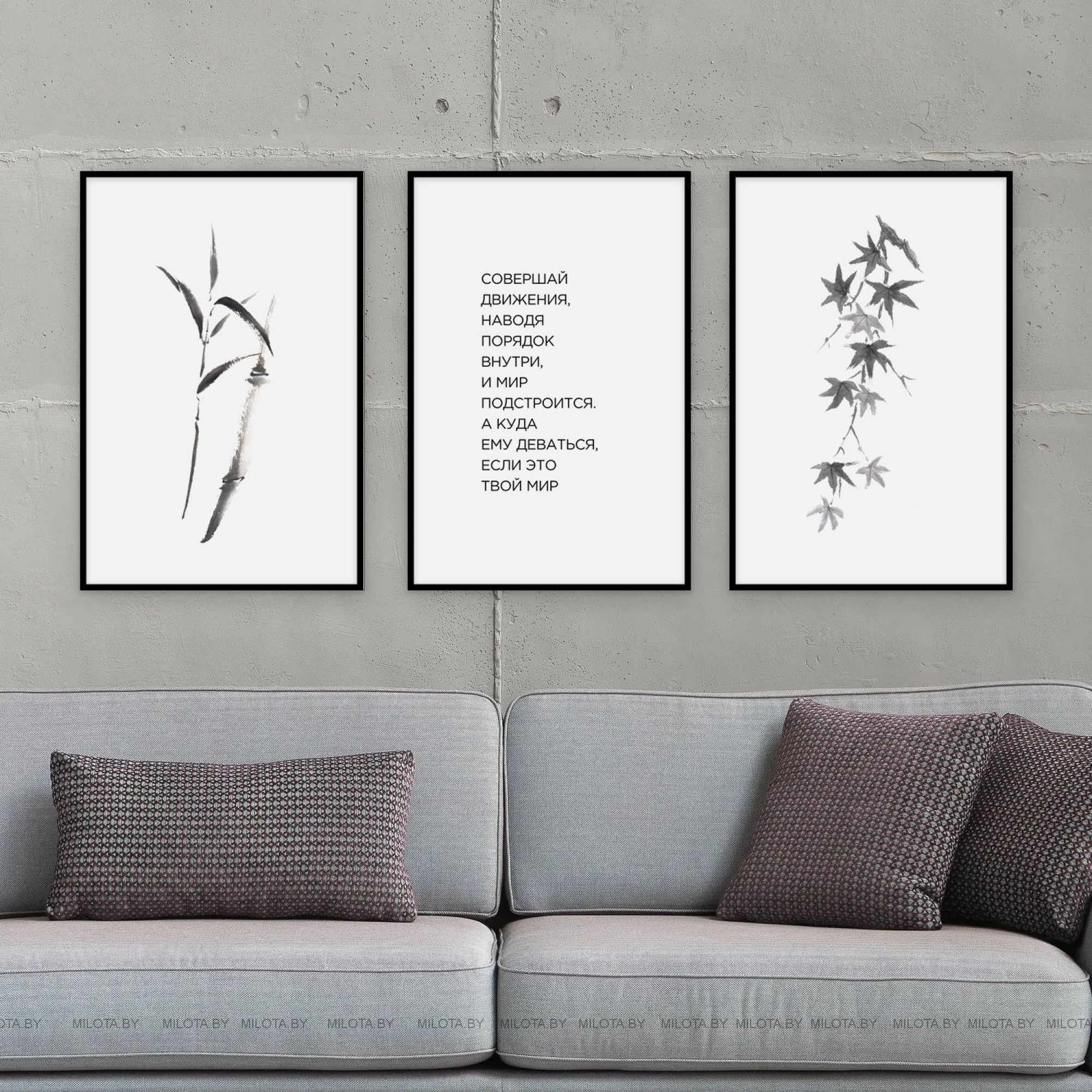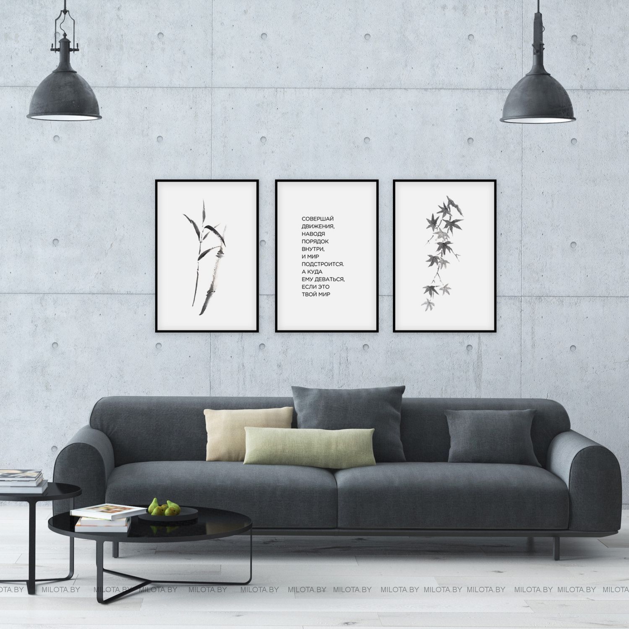 В набор входят 3 интерьерных картины размером 40х60 в деревянных рамах неокрашенного дерева, либо белого / черного цвета.