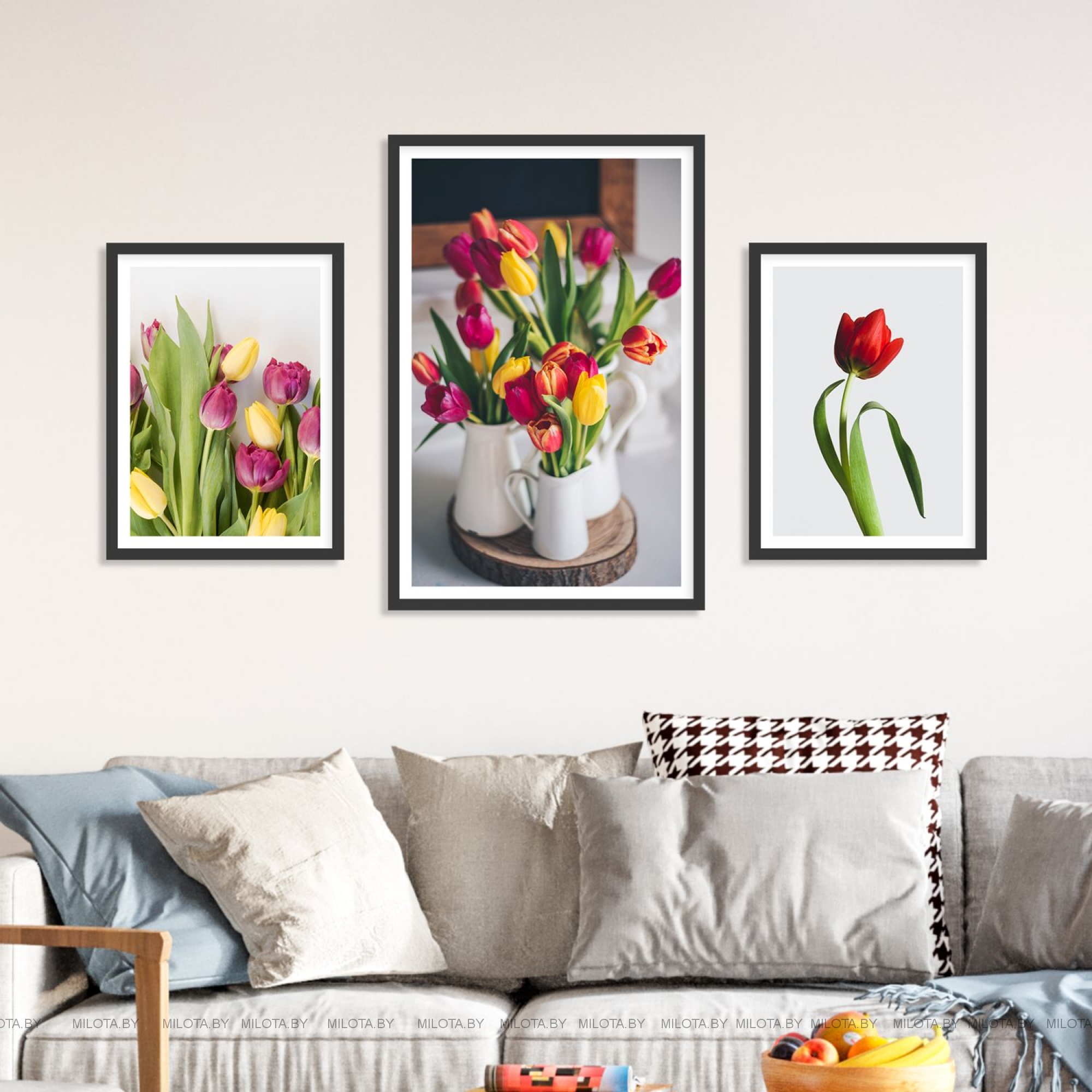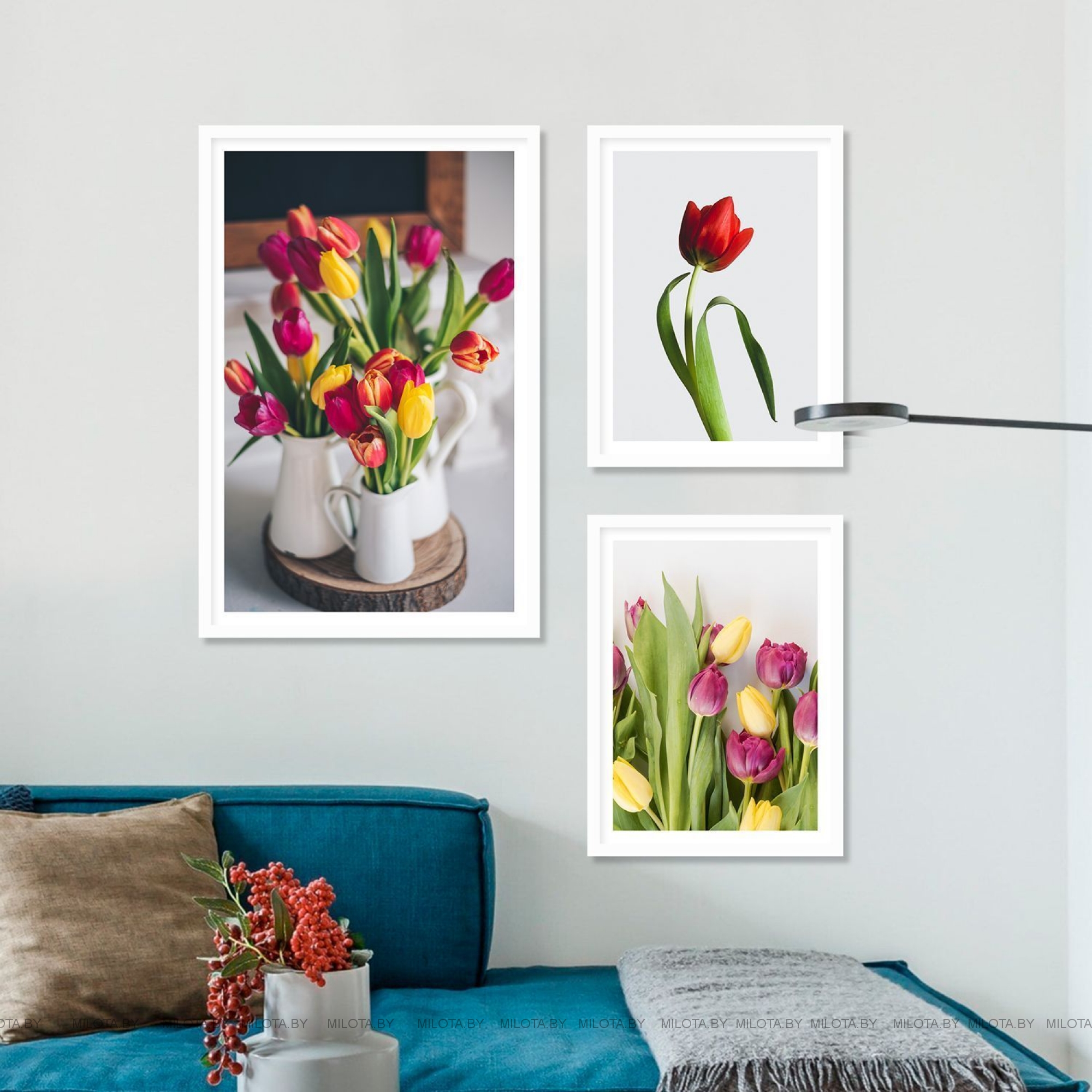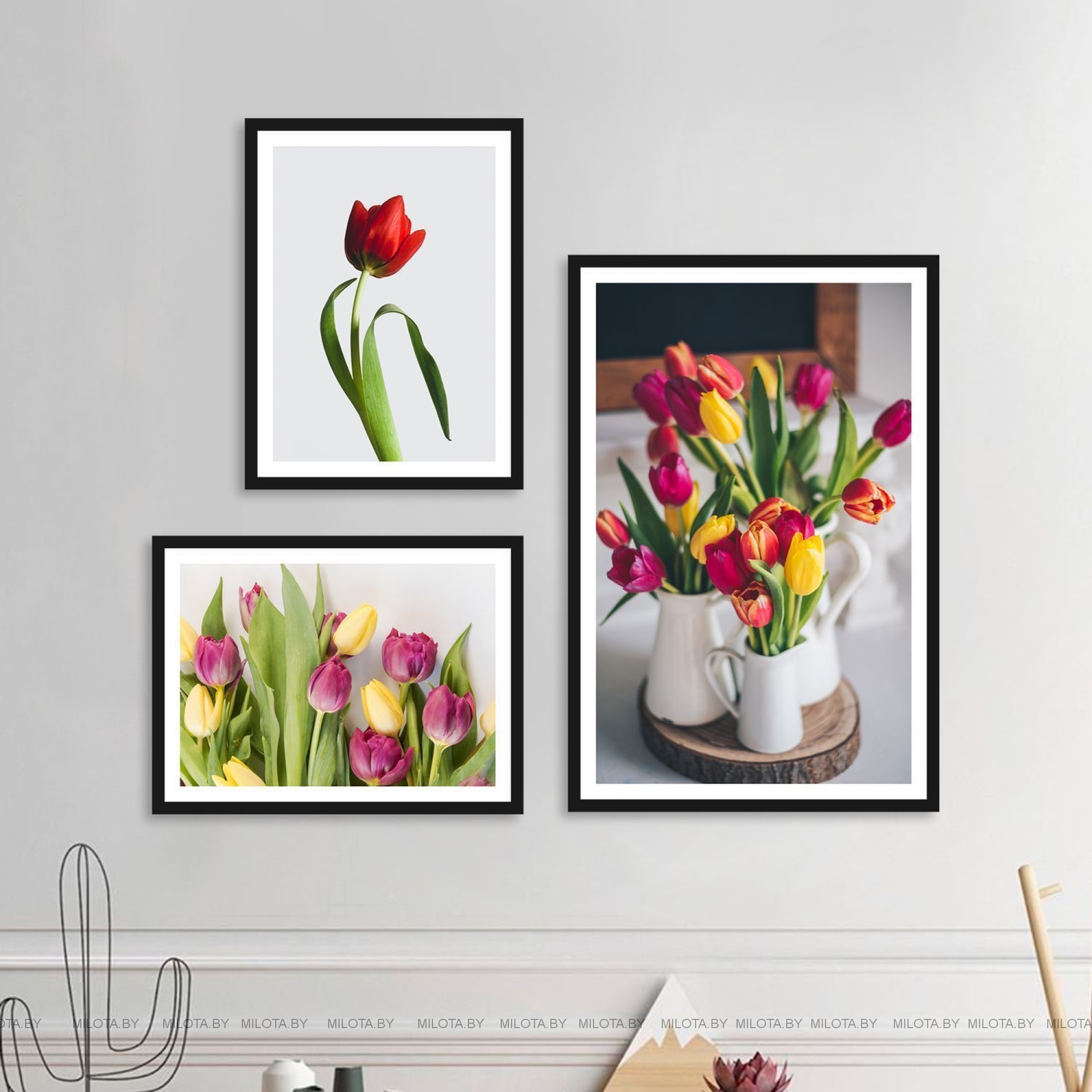 Вселите весну в ваш дом, разместите этот чарующий набор с тюльпанами у себя на стене. Такое трио отлично впишется в любой интерьер, будет радовать своим светом и красками, позволяя наслаждаться весной каждый день. Наши постеры всегда можно сменить на новые под настроение или новый сезон. А постеры без рам совсем не дорогие.