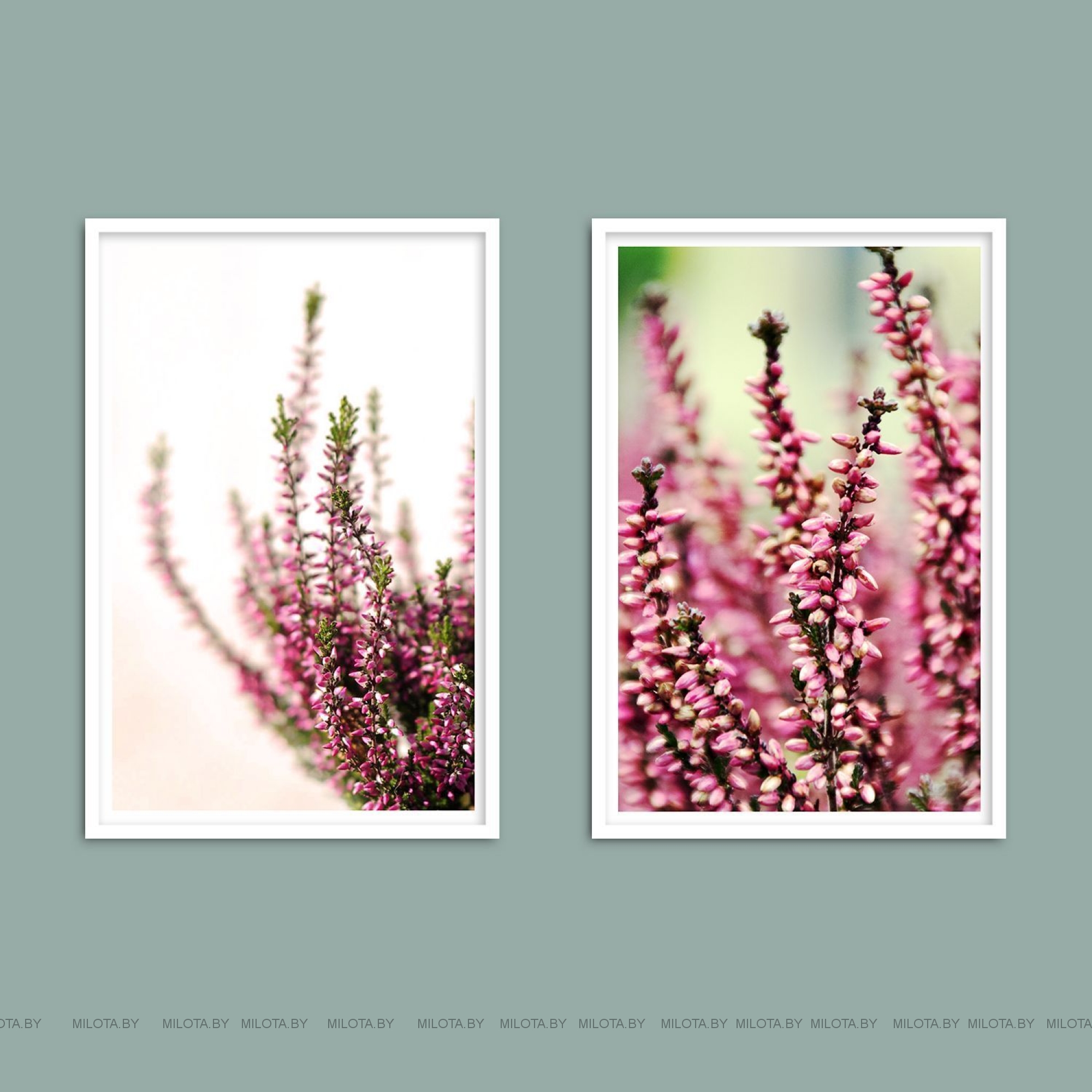Романтично-цветочная пара для оформления интерьера "Вереск". В набор входит: 2 постера форматом А2 (40х60см) в деревянной рамке с небьющимся стеклом.