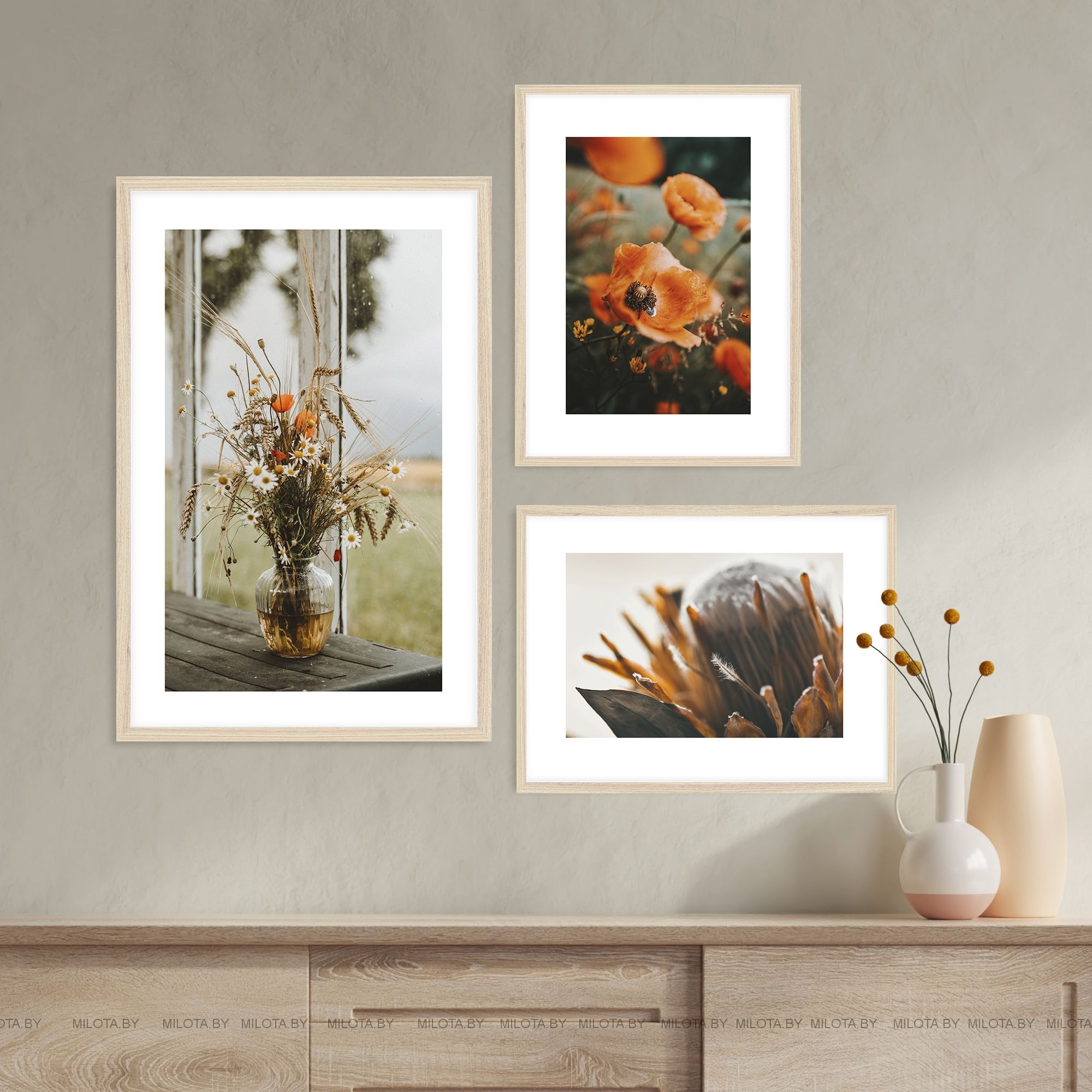 В набор входят 1 постер размером 40х60 см и 2 постера 30х40 см в деревянных рамах неокрашенного дерева, либо белого / черного цвета.